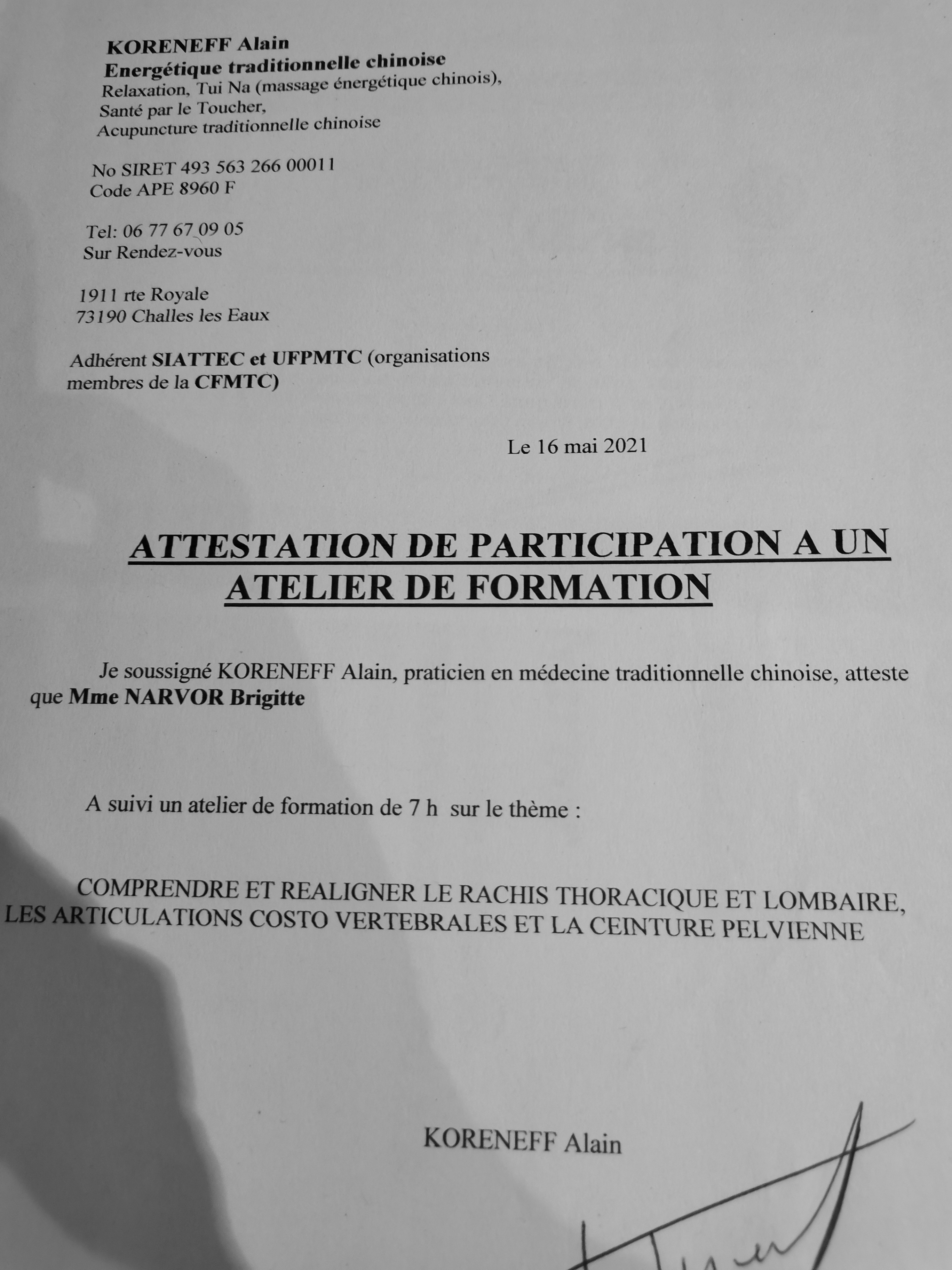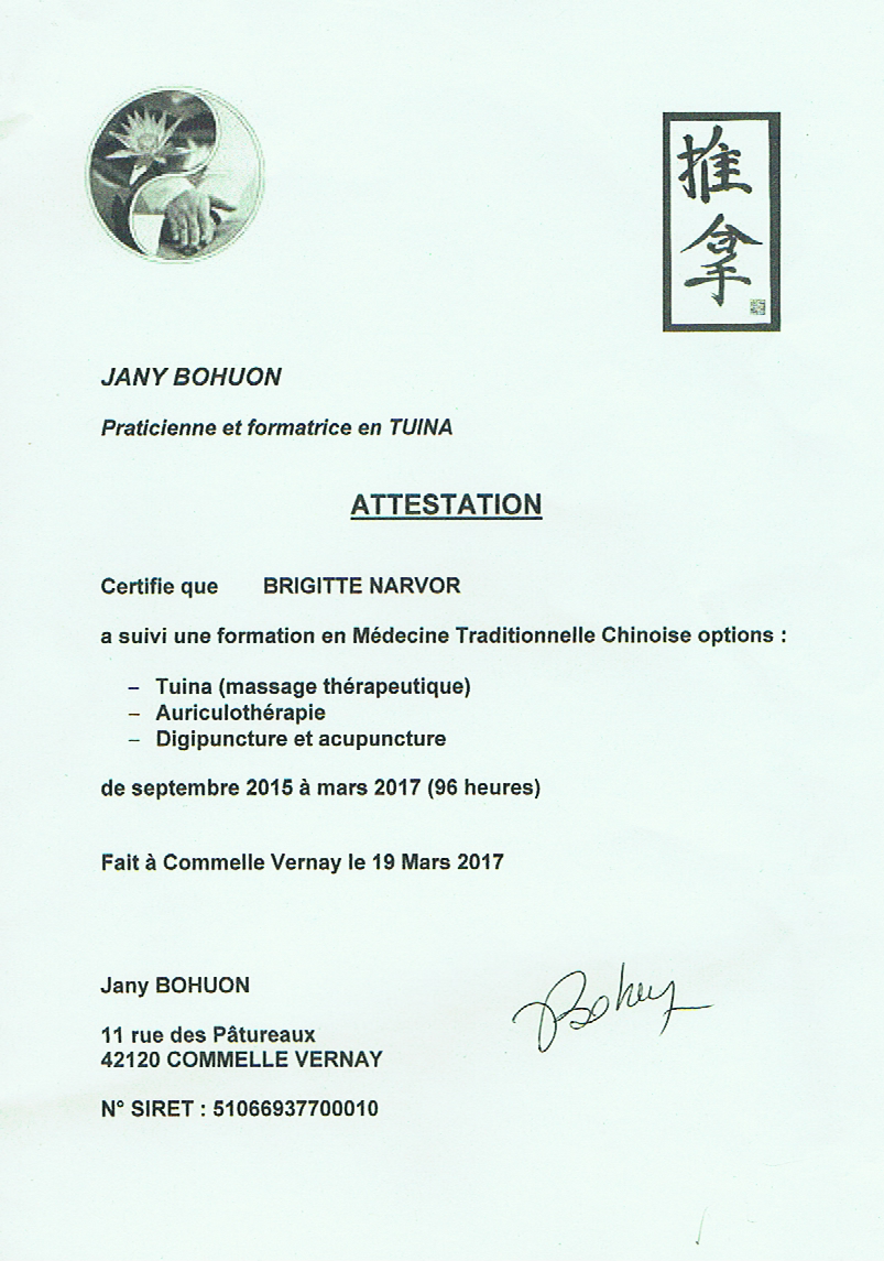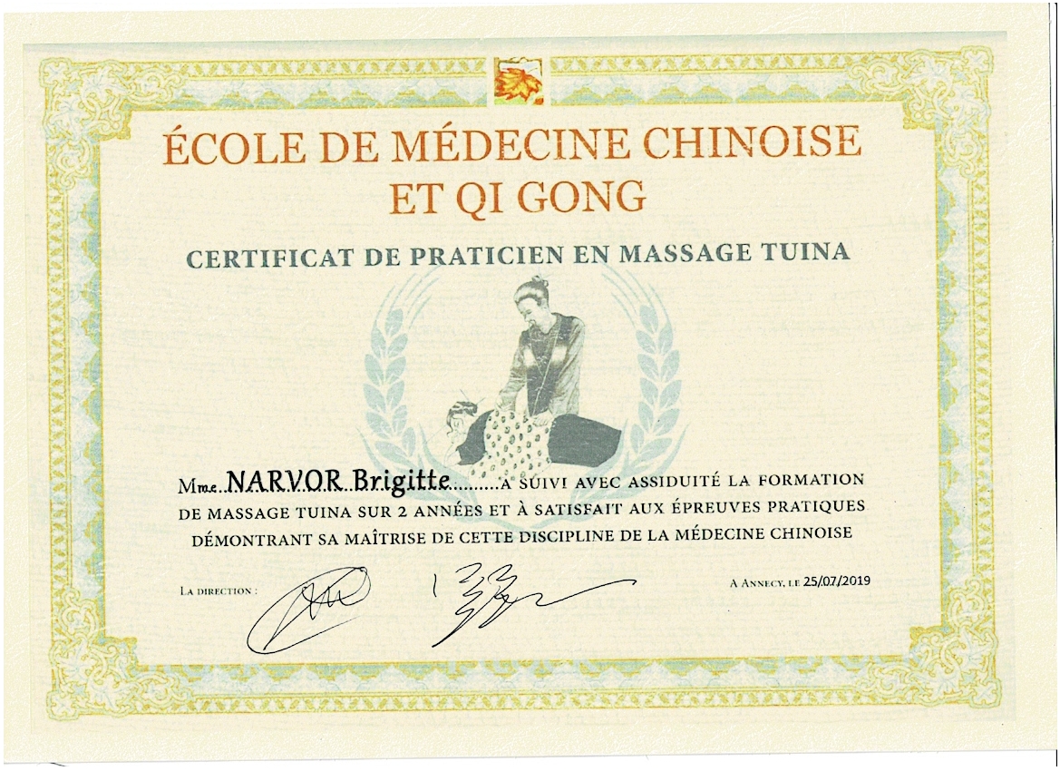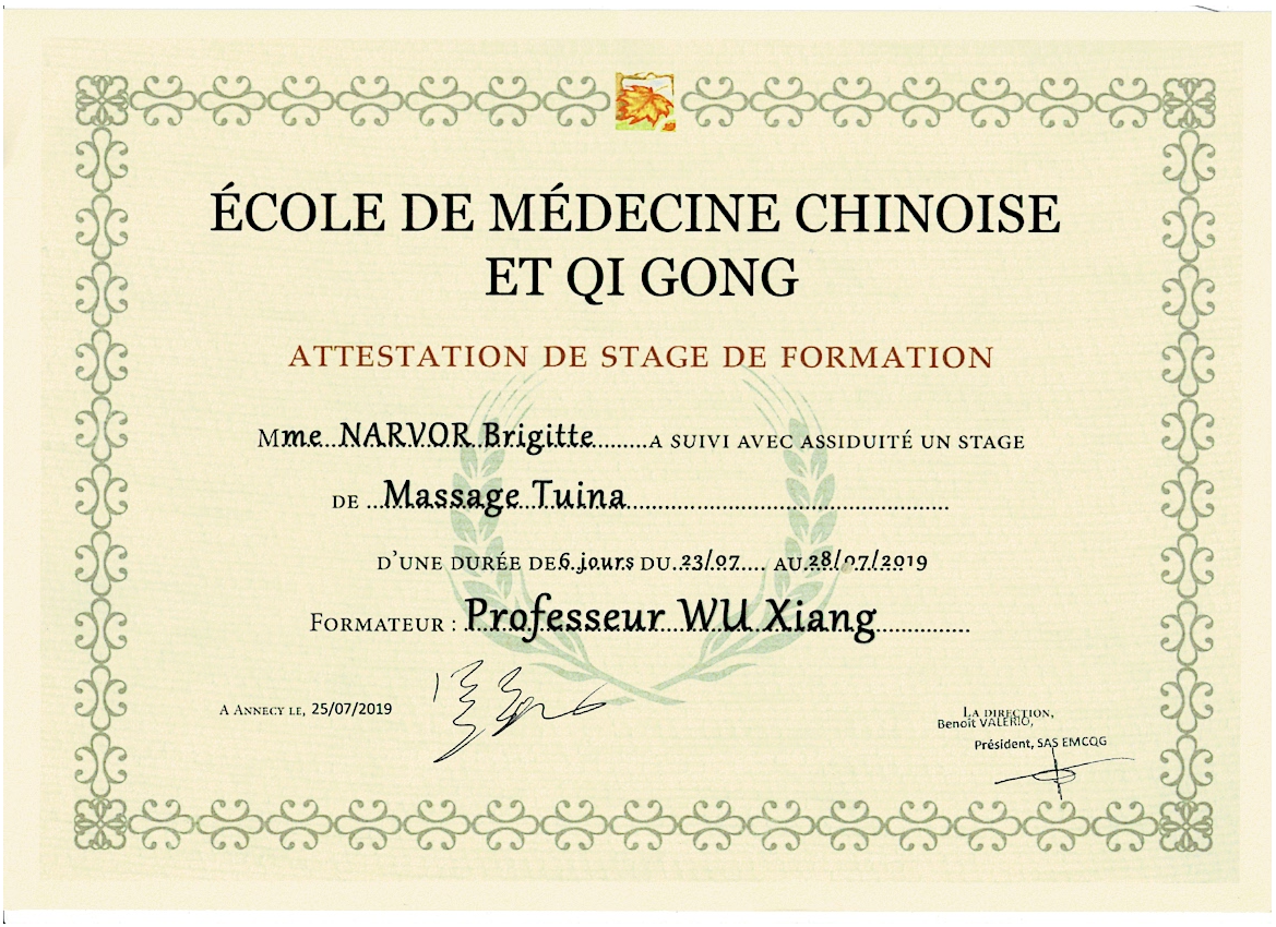 - Certificat de praticienne en massage TUINA