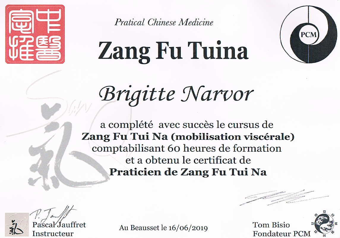 - Certificat de Praticienne de ZANG FU TUI NA