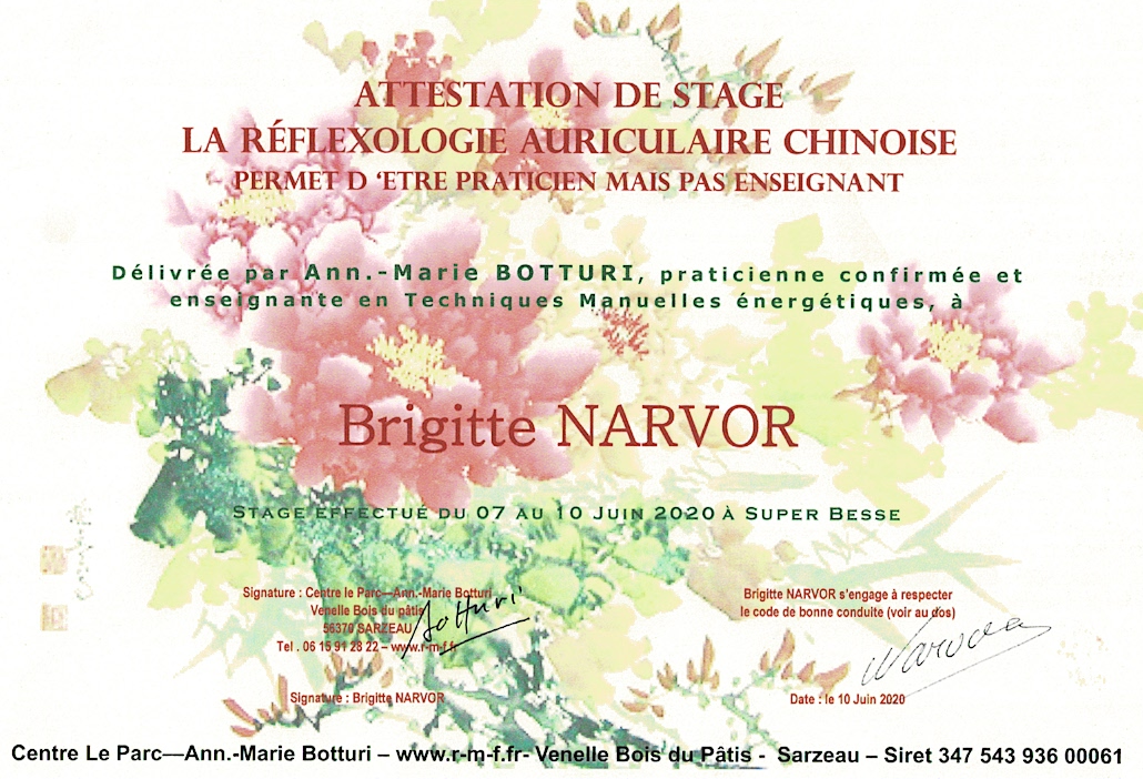 - Certification de praticienne en réflexologie auriculaire chinoise.
