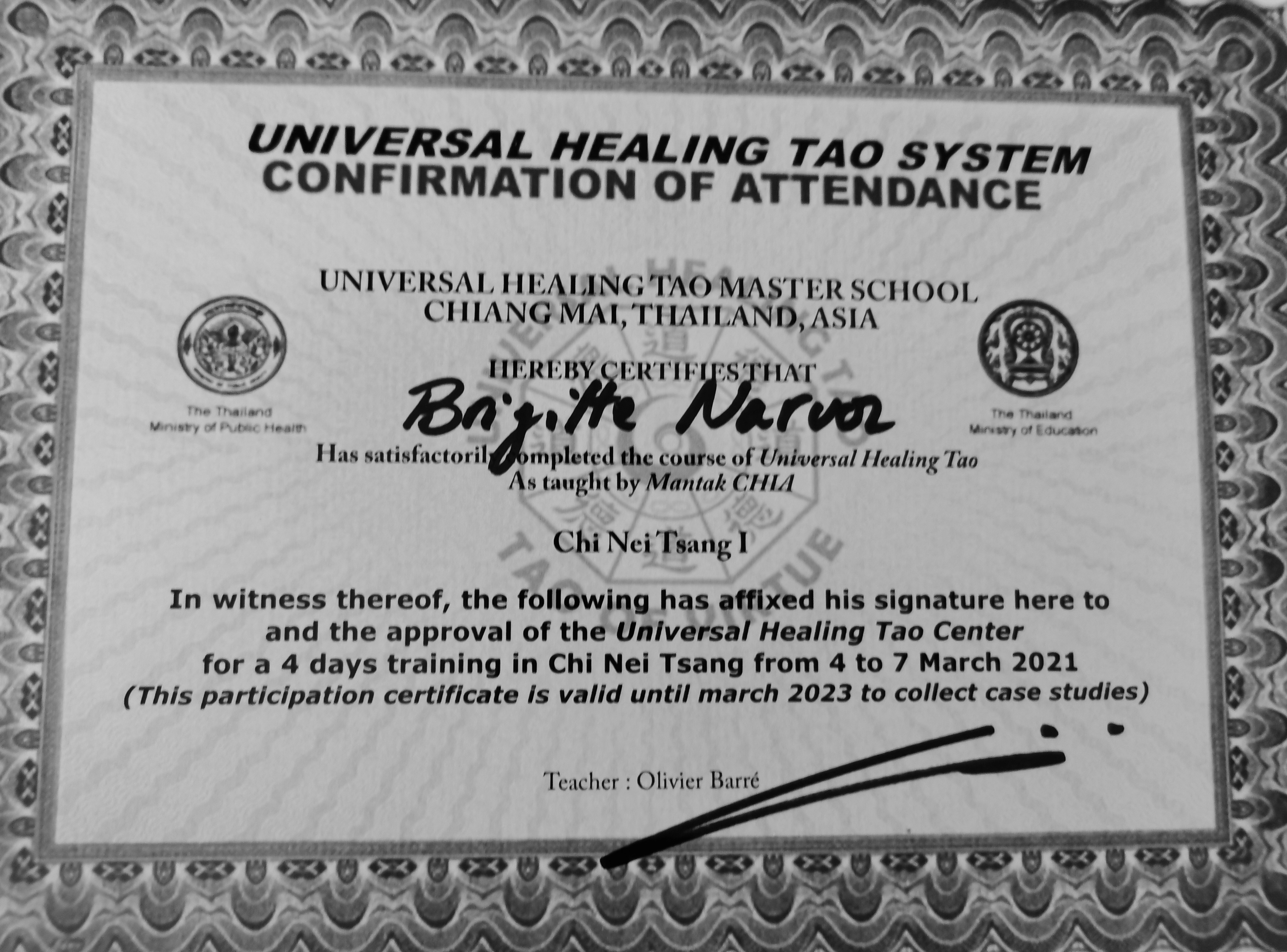 - Certificat de Chi Nei Tsang 1 de l’Universal Healing Tao Master School CHIANG MAI THAILAND