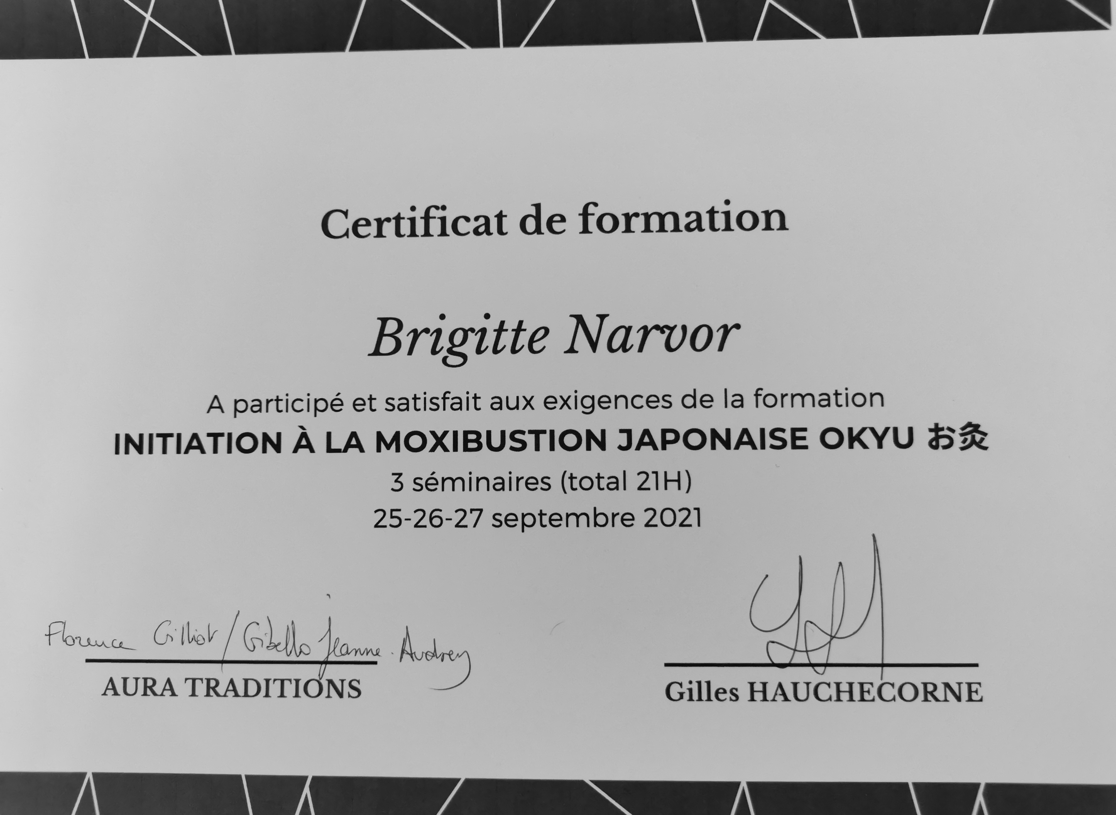 - Certificat de Moxibustion japonaise OKYU, protocole TAIKYOKU de maitre SAWADA.